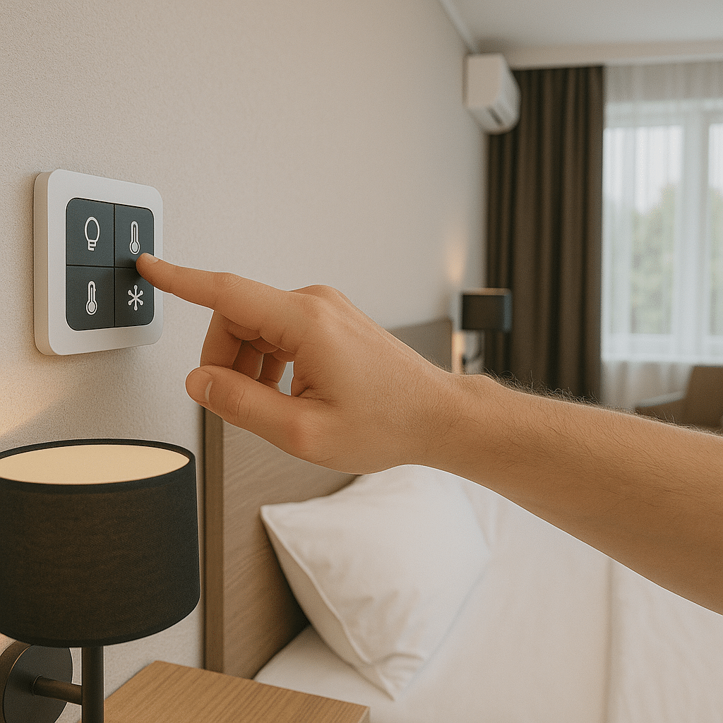 Optimieren Sie die Raumsteuerung in Ihren Hotelzimmern oder Gasträumen. Mit unserer intelligenten Steuerung können Sie Beleuchtung, Heizung, Klimaanlage und Beschattung zentral und automatisiert steuern – individuell angepasst an die Bedürfnisse Ihrer Gäste.